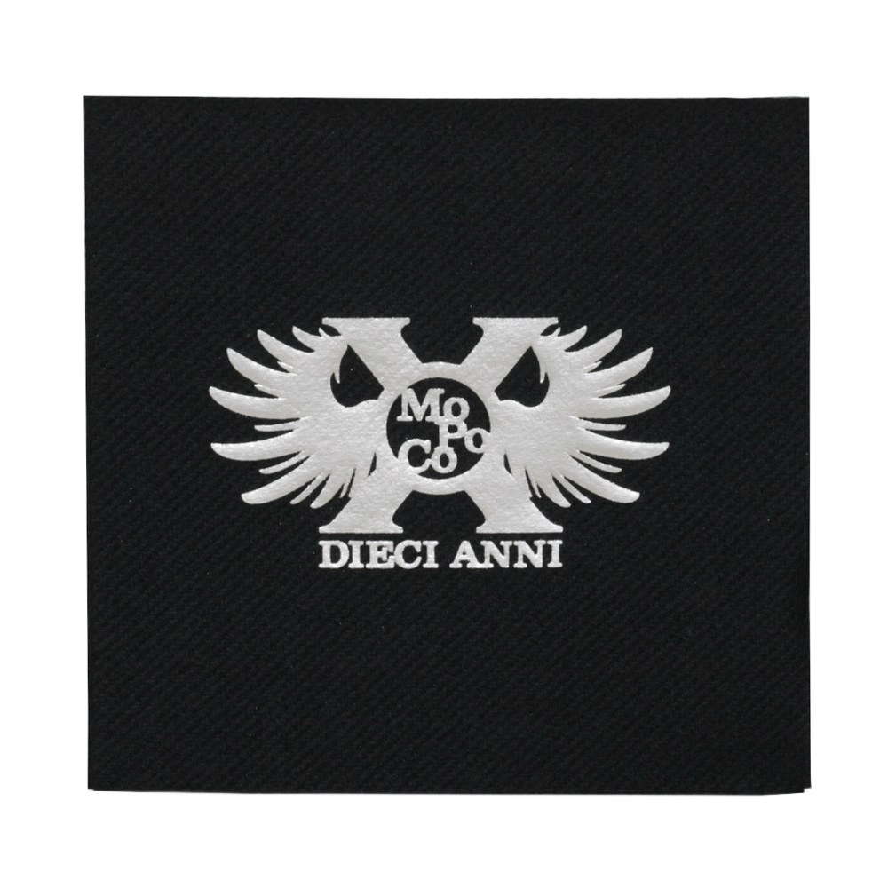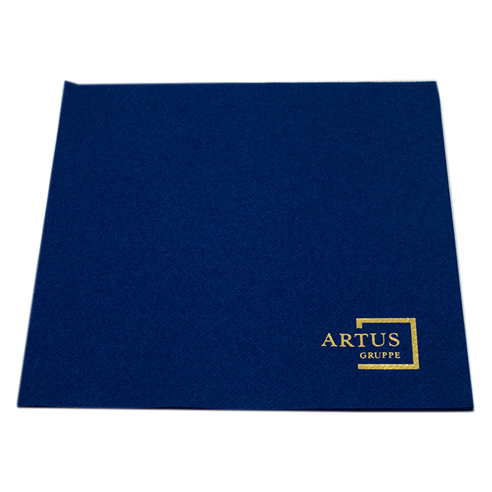 Bei hohen Temperaturen wird die metallicfarbene Beschichtung einer speziellen Folie gelöst und mit einem Prägestempel auf der Serviette fixiert. So erzielen wir eine hohe Farbdichte, die Ihrem Schriftzug oder Motiv eine optische Dreidimensionalität verleiht.